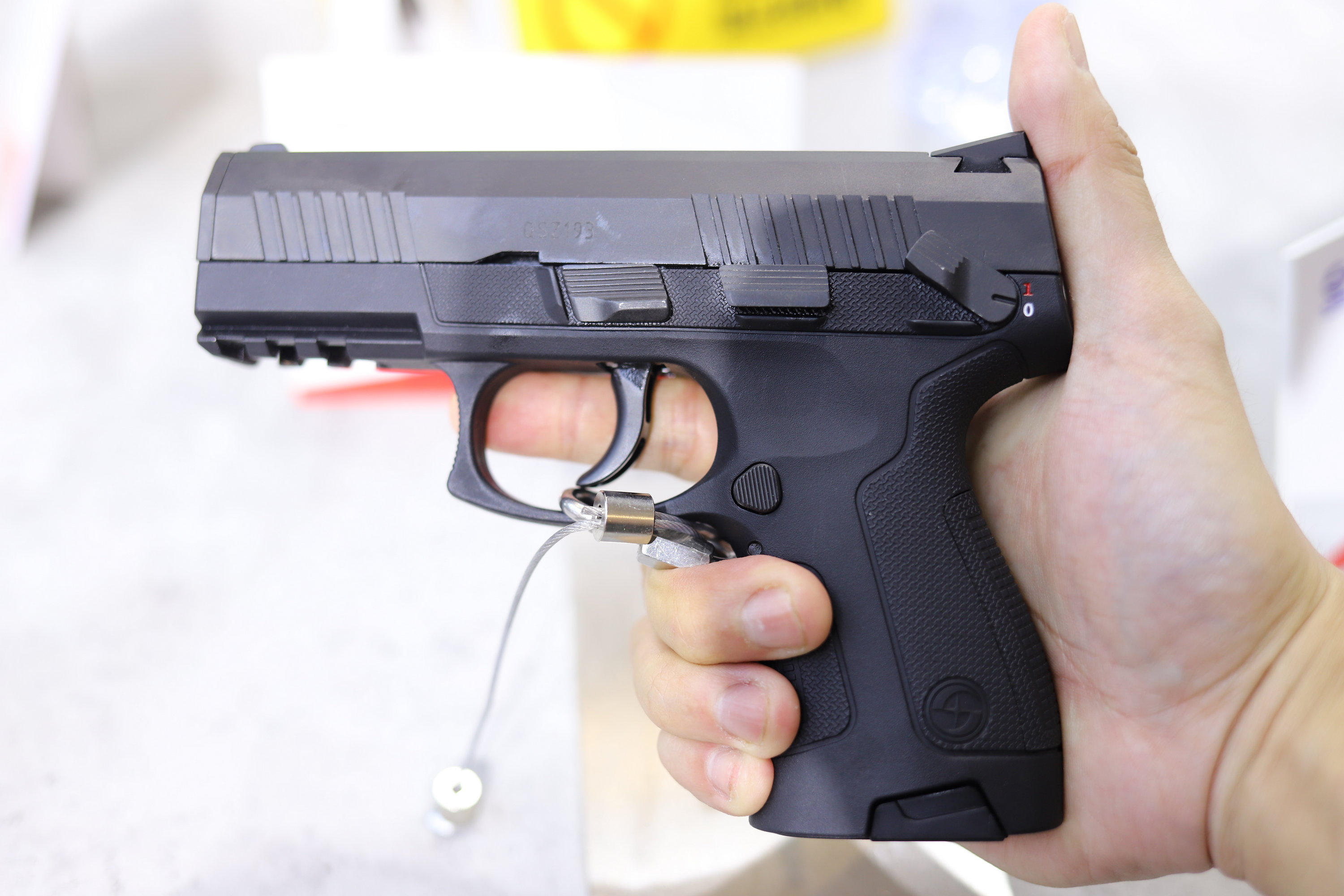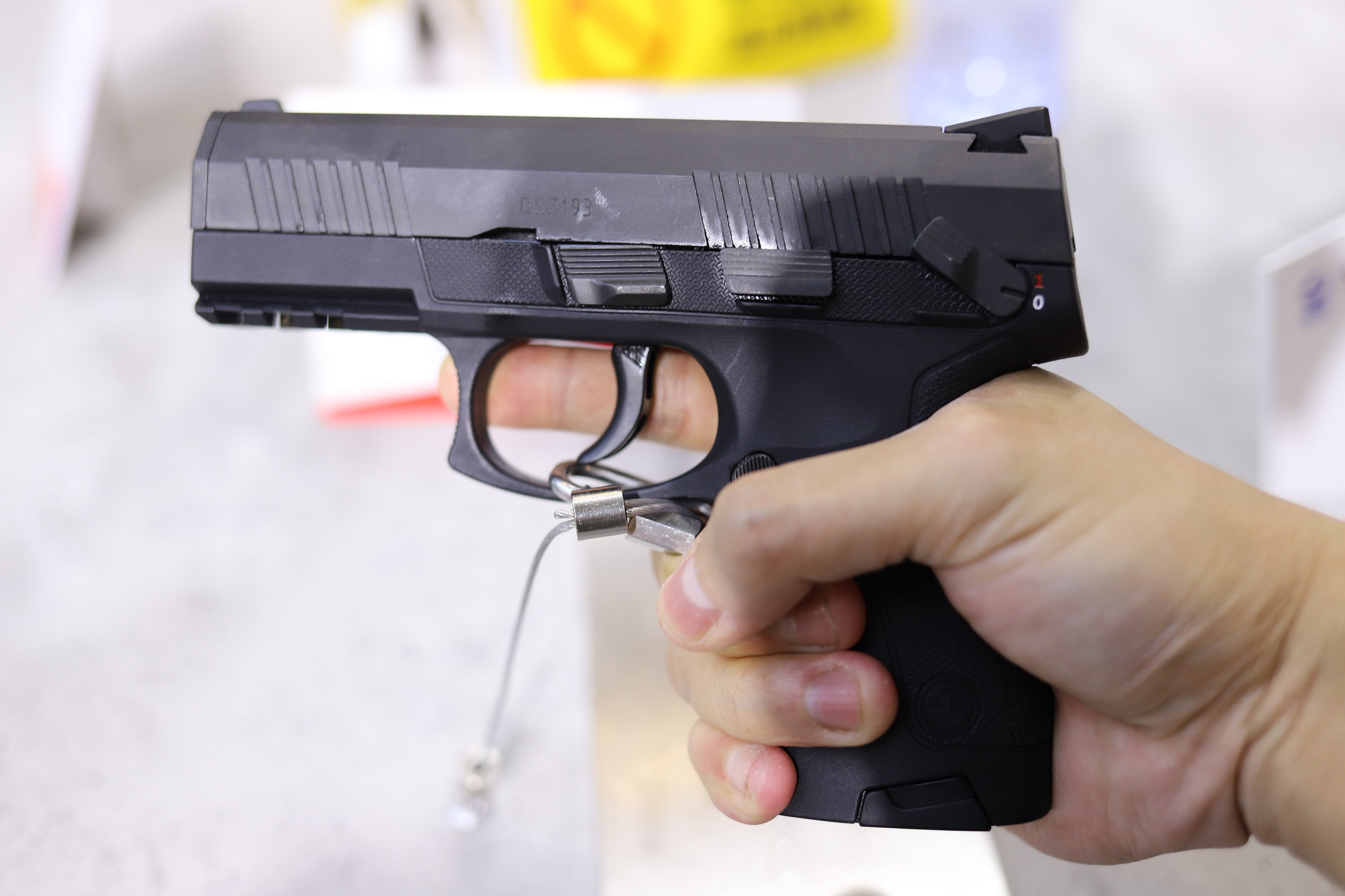QSZ193式自动手枪是一款击针平移击发的袖珍自动手枪,整体呈哑光黑色,套筒为钢制,套筒座为工程塑料制作,扳机护圈前部设计有皮卡汀尼导轨,可以安装各种附件。其套筒前后均设计有防滑纹,可满足不同习惯的射手使用,套筒尾部设置有膛内有弹指示器,白天可以看见,夜间可以通过触摸来判断(有弹状态会有凸起);该枪的套筒座上设计有手动保险和空仓挂机,均为双面设计,提高了人机功效。