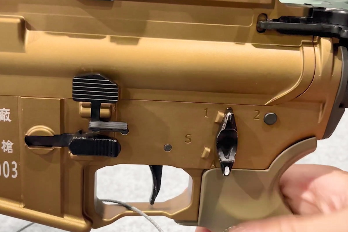 T112的击发机构仍然沿用T65K2、T91的3种射击模式的设计,即可选择半自动、点射和全自动,但有所改进。首先,T112的受控点射模式并非以往T91的3发点射,而是改为2发点射。因此快慢机在点射位置的标记是“2”而非“3”。其次,快慢机的装定顺序与以前的一样仍然是“全自动-保险-半自动-可控点射”,但转动角度比以前的要小。以前的设计一共270度,每转动90度为一档,而T112的转动角度目测大概在220度左右,拇指操作起来会比以前的要便捷一点。
