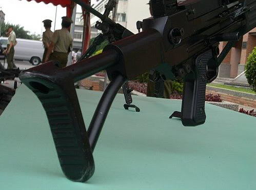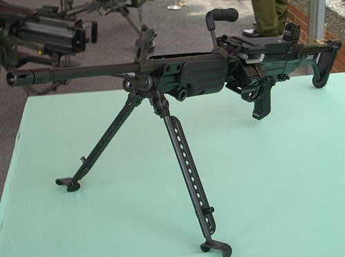 两脚架的形状与旧的57式机枪(仿制M60)和T74机枪相同,但因为尺寸较宽且无预留空间,所以不能像FN Minimi那样折叠到护木下面,只能向前折叠。虽然比起FN Minimi的两脚架更坚固,但却为携行带来不便。