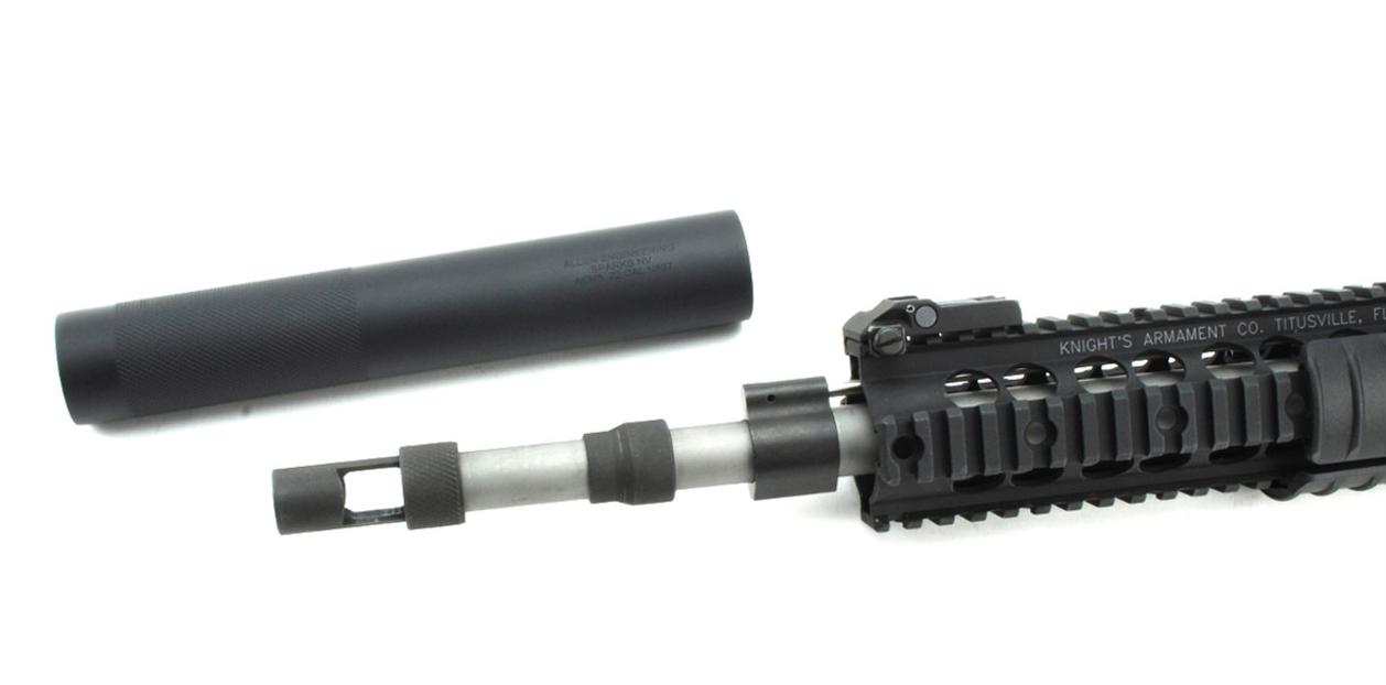 ![]() 民间轻武器玩家利用AEM5消声器将他的AR步枪改装成“戈登式卡宾”时,需要在刺刀卡笋上套上一个刺刀座固定套环。另外因为AEM5的安装深度比较短,所以还必须截短枪管。注意:AEM5配套的刺刀座套环与M4-Delta的并不相同,因为其伸出的轴套是锥面形状 |
