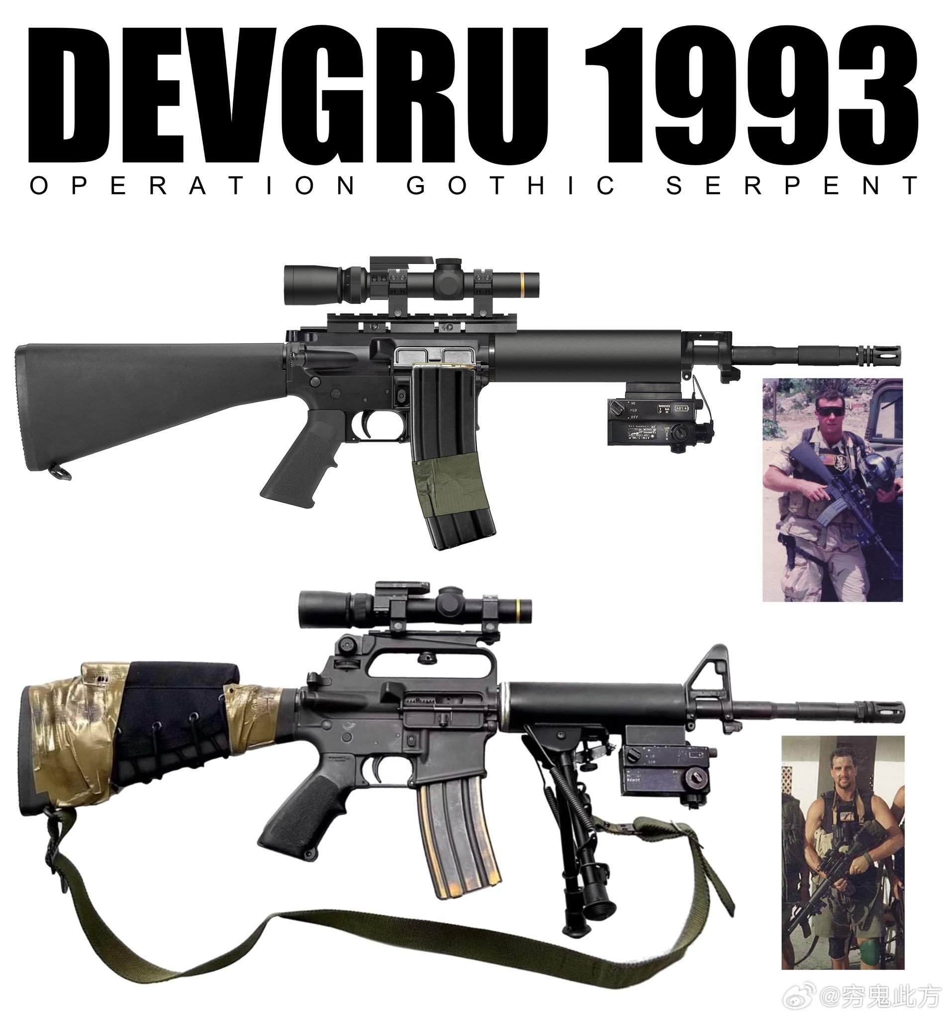 1993年在索马里的海豹六队黑队狙击手,用上了长度较短的阿玛莱特筒形浮置护木的RECCE步枪