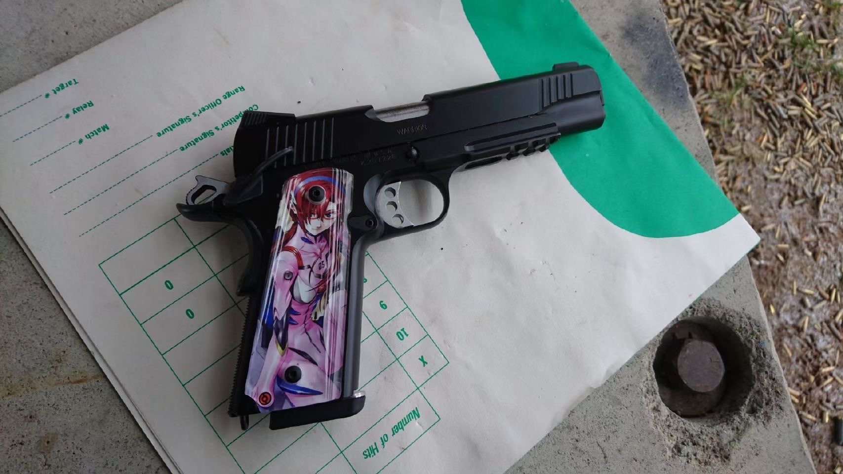 LAPD SWAT在2009年开放日上展出的1911手枪,橙色握把片的是COLT旧枪,黑色的就是KIMBER TLE II