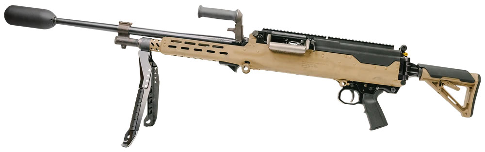 供弹方式为可散弹链,从左侧供弹,单程供弹机。链节结构其实是M13弹链的放大版。握把和扳机组安装在机匣底部,横闩式手动保险在扳机护圈上方。机匣尾部连接有伸缩式枪托。折叠式两脚架安装在护木底部,腿架长度可调。该枪也可使用为M240和M249研制的M192轻型三脚架,也能安装在各种车辆或直升机的载具射架上。机匣顶部和受弹机盖顶部都有皮卡汀尼导轨,用于安装瞄准装置。护木两侧也有皮卡汀尼导轨。