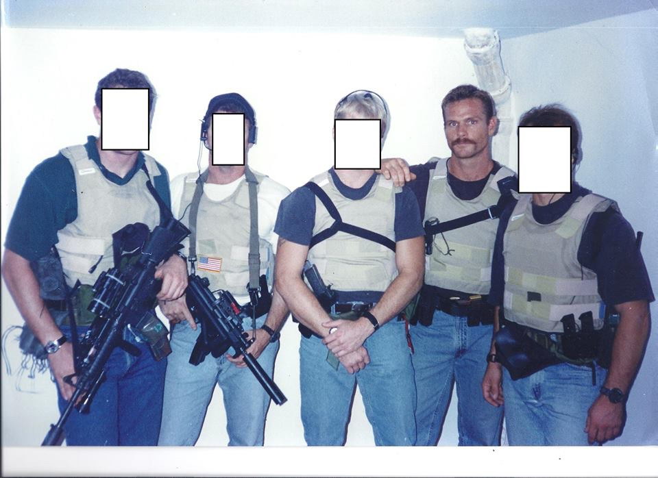 三角洲队员在“低可视度”行动学习中的装扮,左边第2人手持安装消声器的MP5K-PDW,照片中没打码的是退役三角洲队员Pat Mcnamera