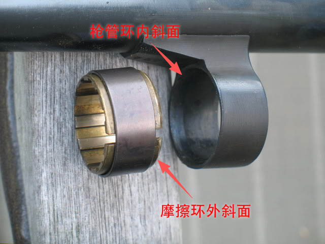 黄筒圈就是摩擦环,图中可见是一个开口环,所以当它受到枪管环挤压时直径就会收紧,从而抱紧管状弹仓