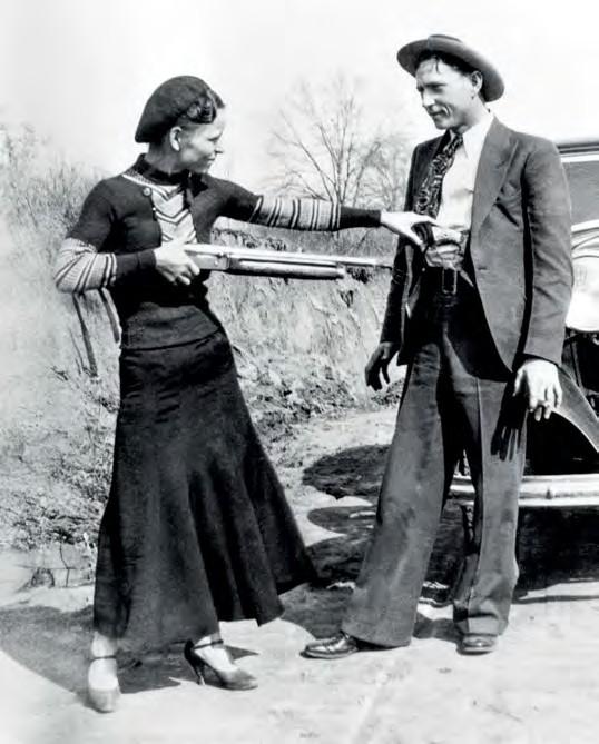 美国1930年代初著名的雌雄大盗邦妮·帕克(Bonnie Parker)和克莱德·巴罗(Clyde Barrow),左图是邦妮拿着Auto-5指着男朋友自拍,右边是这两人被FBI伏击射杀后,FBI特工向公众展示在他们的车上缴获的武器